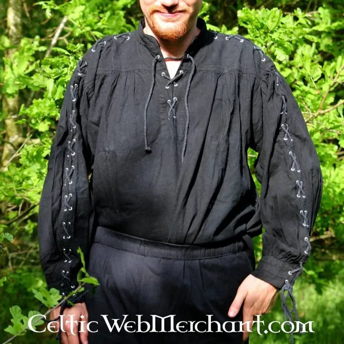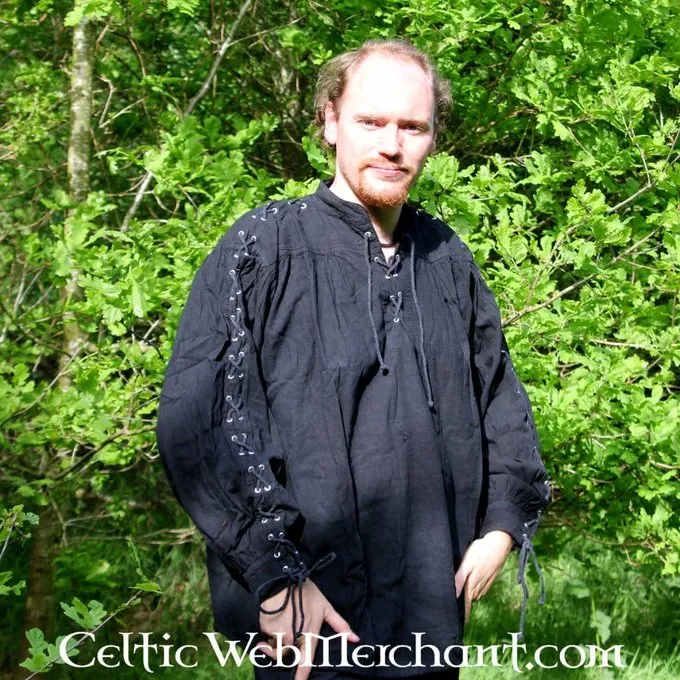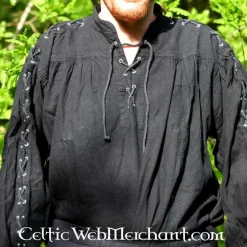 Cette chemise pratique convient à porter séparément ou sous un doublet ou un gilet. Il a des lacets pour un look authentique. La chemise est disponible dans les couleurs noir, rouge, marron et vert.