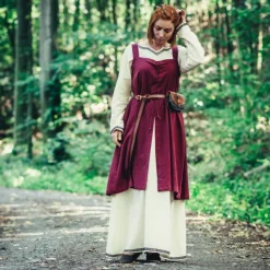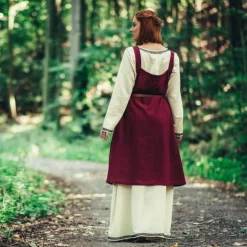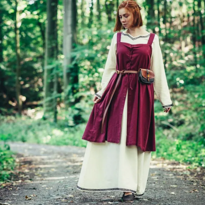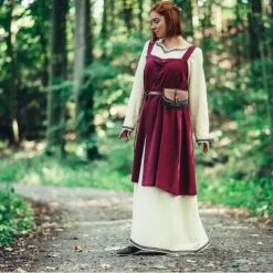 Le hangeroc est un type de robe qui a Ă©tĂ© portĂ© par les vikings et autres personnes du dĂ©but du Moyen Age sur une robe slip. Le hangeroc Ă©tait Ă lâorigine portĂ© avec des broches de tortue, pour fixer le devant aux Ă©paules. La partie de lâĂ©paule Ă©tait souvent beaucoup plus longue et des broches de protection Ă©taient utilisĂ©es pour soulever le tissu devant juste au-dessus des seins. La plupart des reproductions modernes de hangeroc ont dĂ©jĂ la longueur correcte, aussi les broches de tortues ne sont-elles pas nĂ©cessaires Ă des fins pratiques. Mais vous pouvez simplement porter les broches de tortue comme dĂ©coration, ou encore soulever Ă votre goĂ»t la partie avant de la hangeroc. Entre la broche de bouclier, les femmes portaient un certain nombre de brins avec des perles colorĂ©es. Ils portaient Ă©galement une ceinture par-dessus le hangeroc, ce qui donnait plus de forme au vĂȘtement mais Ă©tait Ă©galement utile pour suspendre la clĂ©, une pochette, un couteau, etc. Cet hangeroc est ouvert Ă l’avant. Vous pouvez l’attacher avec les lacets en coton sur le devant, vous pouvez Ă©galement les utiliser pour crĂ©er un ajustement plus serrĂ©.
