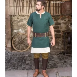 Cette tunique est basĂ©e sur des vĂȘtements portĂ©s au dĂ©but du Moyen Ăge par les Vikings et d’autres peuples du nord-ouest de l’Europe. Il convient Ă©galement Ă la reconstitution mĂ©diĂ©vale en raison de sa conception universelle. Vous pouvez porter la tunique sur elle-mĂȘme ou la combiner avec un sous-vĂȘtements par temps froid. Cette longue tunique viking atteint les genoux. Elle prĂ©sente un col en V et une fente Ă l’avant et Ă l’arriĂšre pour un confort ultime lors des batailles, etc. Vous pouvez associer la tunique Ă une ceinture pour un meilleur ajustement ou raccourcir la tunique avec une ceinture en drapant une partie de la tissu dessus. Au dĂ©but du Moyen Ăge, toutes sortes d’objets Ă©taient portĂ©s Ă la ceinture, tels que des sacs, des couteaux, des haches, etc.