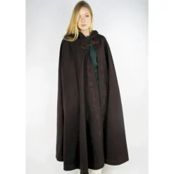 Cette cape de laine mélangée a de beaux bords décoratifs brodés et convient à la reconstitution et au GN. Le tissu lourd est légèrement résistant à l’eau et chaud pour les mois d’hiver. La cape peut être attachée avec une belle fibule en forme de spirale avec la tête de dragon.