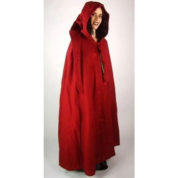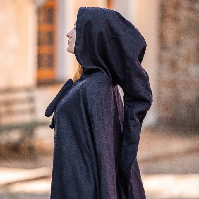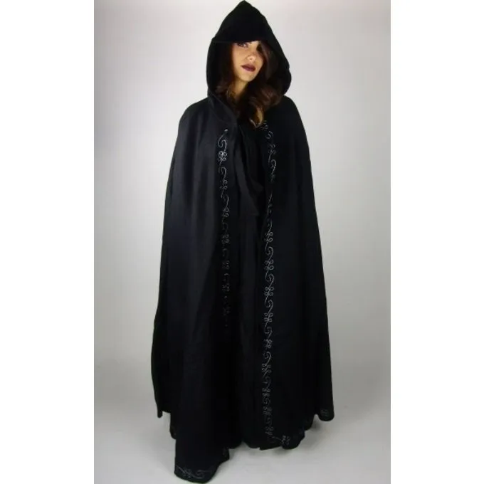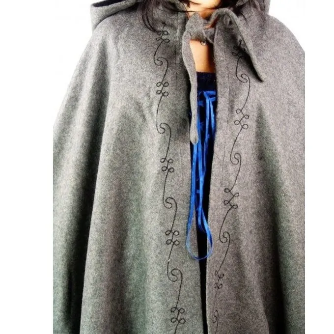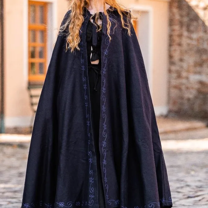 Ce manteau de mĂ©lange de laine a des bords avec des motifs Ă©lĂ©gamment brodĂ©s. Convient Ă la fois Ă la reconstitution et au LARP. Le manteau a des sangles Ă l’avant pour la fixation.