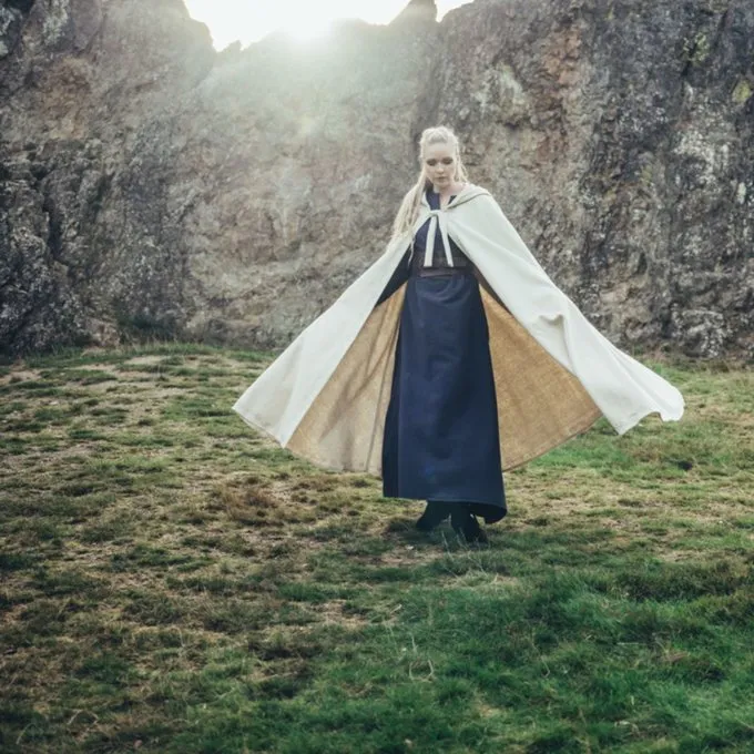 Ce manteau de mélange de laine a des bords avec des motifs élégamment brodés. Convient à la fois à la reconstitution et au LARP. Le manteau a des sangles à l’avant pour la fixation.