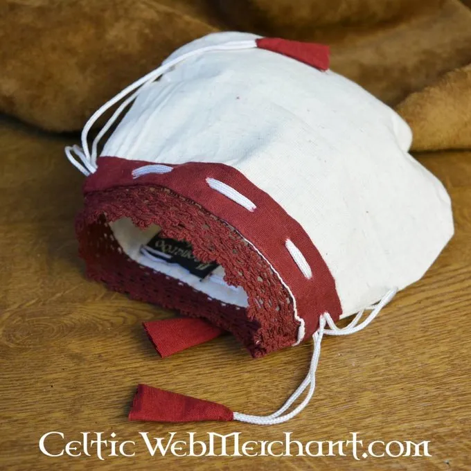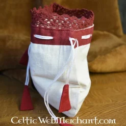 Cette Ă©lĂ©gante pochette argent complimente la tenue de chaque dame. Le sommet est dĂ©licatement fini avec un motif de dentelle et de la corde qui ferme la poche a des dĂ©tails rouges ludiques. L’accessoire parfait pour les dames rejouant le Moyen Age ou de la Renaissance.