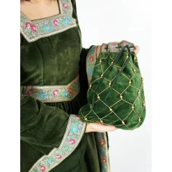 Cette pochette de luxe peut ĂȘtre utilisĂ© pour la reconstitution mĂ©diĂ©vale et de la Renaissance. Il complĂšte une noble, une tenue aristocratique ou royal. Le tissu veloutĂ© de la poche est dĂ©corĂ© d’un motif de fil imitation d’or et d’ imitation de perles. Il se termine par le bord supĂ©rieur magnifiquement dĂ©corĂ©, ressemblant Ă une tapisserie de luxe.