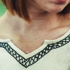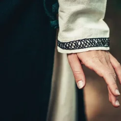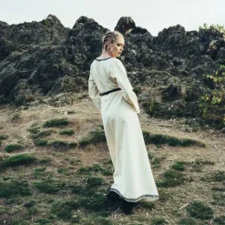 Cette robe est basée sur des images du haut Moyen Âge dans des manuscrits, des sculptures et d’autres formes d’art visuel du haut Moyen Âge. Au bas, aux manches et à l’encolure, la robe a une bordure décorative brodée dans le style du début du Moyen Âge. Cette robe est parfaite pour la reconstitution et le GN des saxons anglo-saxons, des Vikings, des Mérovingiens, des Carolingiens et d’autres cultures européennes du début du Moyen Âge. Aussi idéal pour le cosplay de séries telles que Last Kingdom ou Vikings.