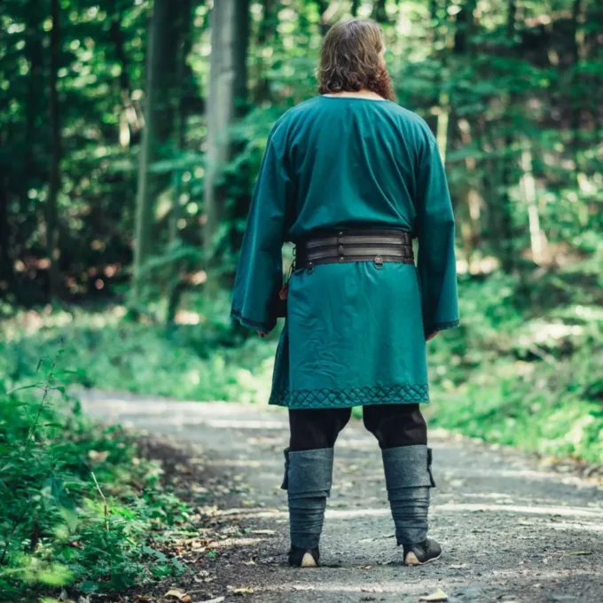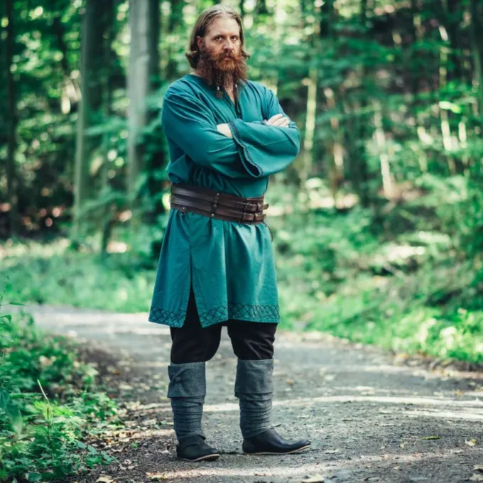 Cette belle tunique convient Ă la reconstitution, au GN et au cosplay du haut Moyen Ăge. Par exemple, les peuples germaniques, les vikings, les anglo-saxons et les normands. Il atteint presque les genoux et le bord infĂ©rieur est ornĂ© dâun motif brodĂ©. La couleur de la tunique faisait rĂ©fĂ©rence au statut social du porteur. Les couleurs telles que le rouge, le bleu et le violet Ă©taient trĂšs luxueuses et coĂ»teuses Ă fabriquer. Les couleurs telles que le marron, le jaune, lâorange, le vert et autres Ă©taient pour lâhomme du peuple. Les pigments avec lesquels ces couleurs sont produites sont moins chers et plus faciles Ă trouver dans la nature. Les guerriers, les paysans et dâautres personnes normales portaient une tunique Ă la hauteur du genou afin que ce ne soit pas leur travail quotidien. La noblesse portait des tuniques au sol, elle devait naturellement moins bouger pendant la journĂ©e, la longueur de son vĂȘtement Ă©tait un symbole de statut.