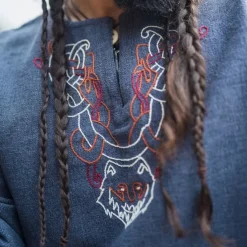 Cette tunique est parfaite pour la reconstitution mĂ©diĂ©vale prĂ©coce, la larp et le cosplay. Il atteint juste au-dessus des genoux et est dĂ©corĂ© de belle broderie. Les manchons ont un motif symĂ©trique constituĂ© de deux lignes d’enroulement dans des couleurs contrastĂ©es. Cette broderie forme un contraste esthĂ©tique avec le tissu de la tunique et de la broderie Ă l’encolure. Cette broderie montre un loup au centre avec un motif de nĆud mĂ©diĂ©val prĂ©coce des deux cĂŽtĂ©s de plusieurs couleurs. Dans la mythologie de la vieille Norse, le loup Fenrir Ă©tait un fils de Loki, le dieu viking de la tromperie. Fenrir a grandi pour ĂȘtre un loup ruse et trĂšs fort, un grand danger pour les dieux. Pour cette raison, ils enchaĂźnaient Fenrir avec Gleipnir: une chaĂźne fine de laquelle Fenrir ne pouvait pas se libĂ©rer avant l’arrivĂ©e de Ragnarok. Dans l’art viking et germanique, les loups ont Ă©tĂ© reprĂ©sentĂ©s dans des scĂšnes de bataille, comme des corbeaux et des aigles. Le loup se tenait pour meurtre, homicide involontaire et rusĂ©. Des hommes dangereux ont Ă©tĂ© dĂ©crits comme des loups, les Berserkers Ă©taient Ă©galement associĂ©s Ă des loups. La dĂ©coration de cette tunique convient parfaitement Ă la reconduction d’un guerrier viking sur le champ de bataille.