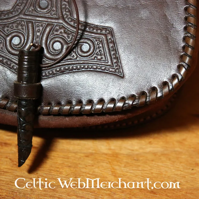 Ce sac est Ă©lĂ©gamment dĂ©corĂ© avec une empreinte de Mjolnir, le marteau du Thor. Le sac peut ĂȘtre accrochĂ© Ă une ceinture avec les deux boucles et peut ĂȘtre fermĂ© par un morceau de cuir torsadĂ©.