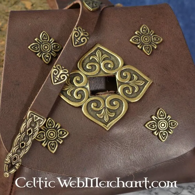 Ce sac est basé sur un original trouvé dans Birka du 9Úme au 10Úme siÚcle. Le montage dans le milieu est basé sur un original à partir de As, mais raccords similaires ont également été trouvées dans Birka. Le sac est fait de cuir de vache et les raccords sont en laiton. Il est de 18 x 23 cm de large.