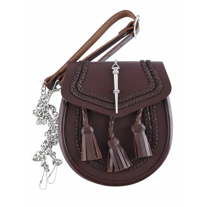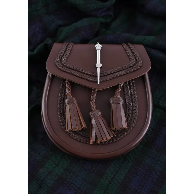 Ce sporran a trois glands en cuir et est ornĂ© dâun motif en cuir tressĂ©. Vous pouvez le fermer avec une Ă©pingle fournie. Le sac est livrĂ© avec une chaĂźne pour accrocher le sporran autour du kilt.
