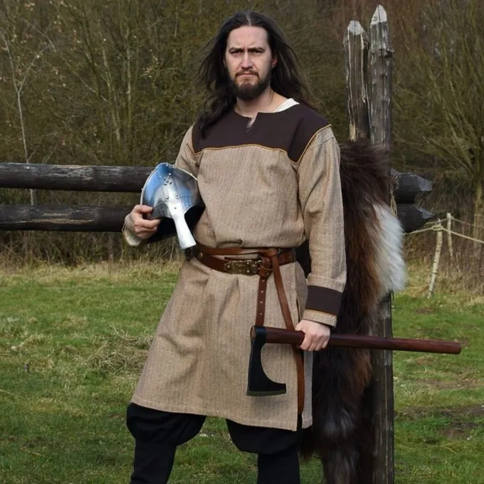 Cette tunique est parfaite pour la reconstitution et le cosplay des premiers peuples de lâEurope occidentale tels que les Vikings, les MĂ©rovingiens et les Francs. La tunique tombe au genou et est faite de coton robuste. Les bandes de tissu qui ornent les manches et le dĂ©colletĂ© sâadaptent Ă©galement Ă la mode du dĂ©but du Moyen Ăge.