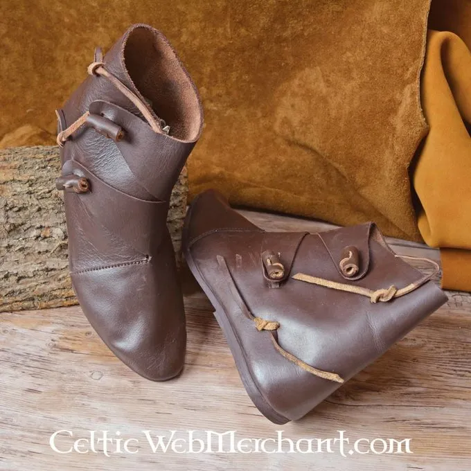 Ces chaussures Viking sont basĂ©es sur des originaux qui ont Ă©tĂ© fouillĂ©s dans la ville viking de Jorvik. Les chaussures sont en cuir de vachette de 2 mm d’Ă©paisseur. Ils ont des semelles en cuir de 5 Ă 6 mm d’Ă©paisseur et sont disponibles dans les tailles 40 Ă 47.