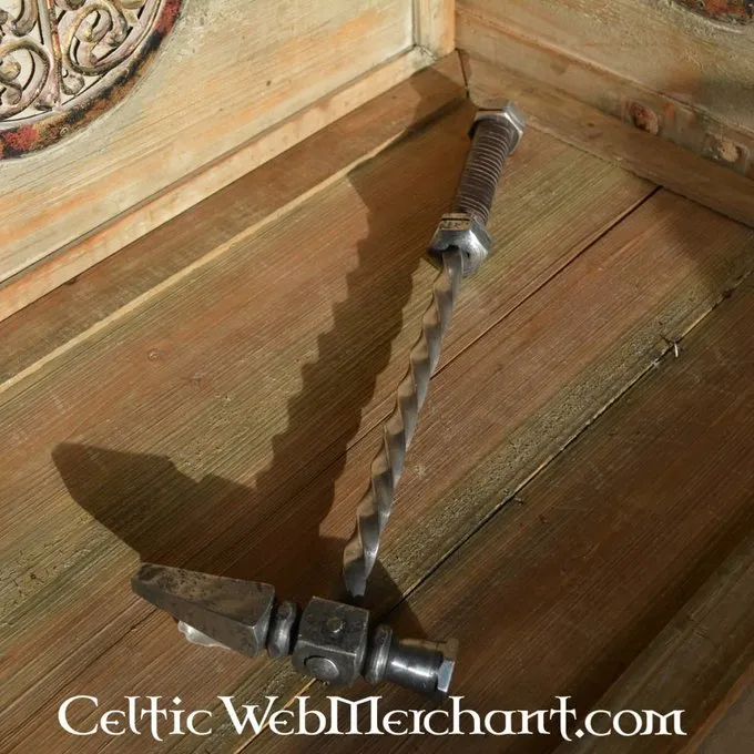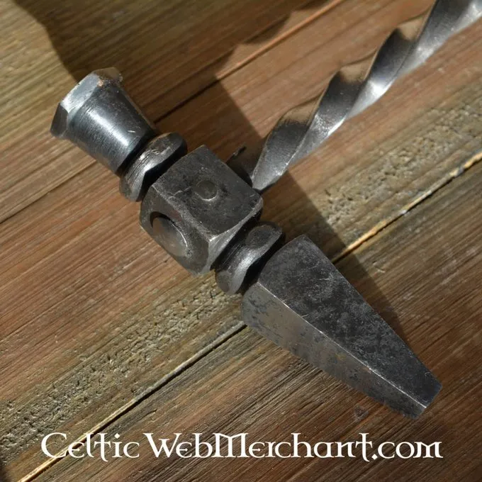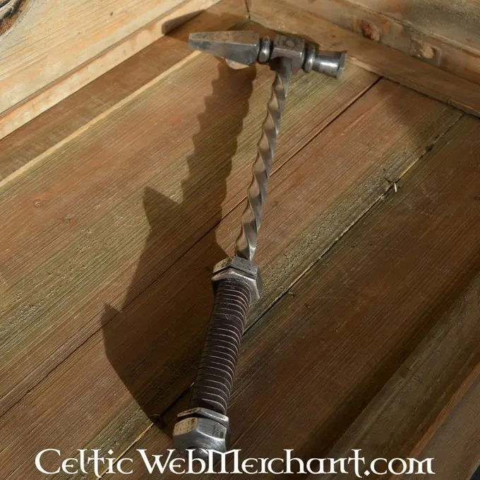Ce marteau est tordu la main de l’acier et a une poignĂ©e torsadĂ©e. La poignĂ©e est enroulĂ©e autour de cuir brun foncĂ©. Le marteau est clouĂ© Ă double pour la sĂ©curitĂ©. Il a une longueur de 45 cm, une largeur de 15 cm et pĂšse environ. 1 kg.